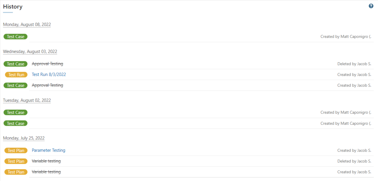 設定した期間と最大の履歴数に基づいて、テスト計画、テスト ラン、テスト ケース全体の行アイテムを表示します。履歴は日付で分類されています。