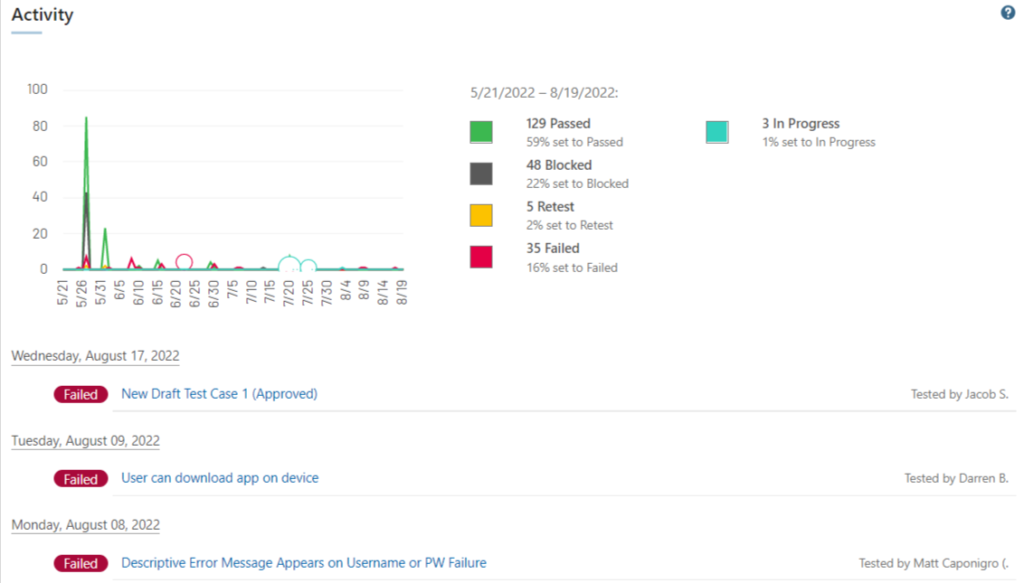 アクティビティ セクションには、指定された期間のテスト結果の表に加えて、テスト ケースをステータスによって分類したパーセント値が表示されます。線のピークにカーソルを置くと、各行の日ごとのテスト ステータスに関する詳細を参照できます。