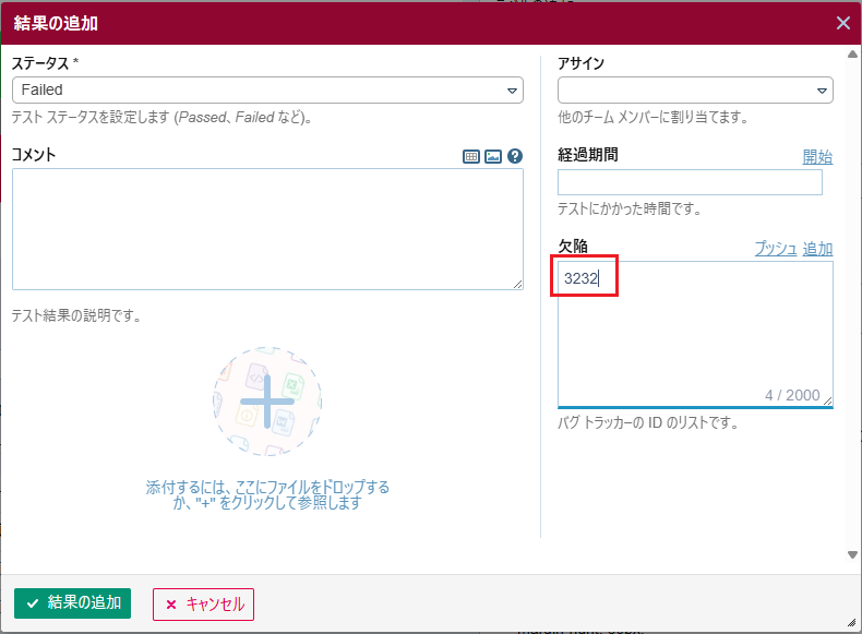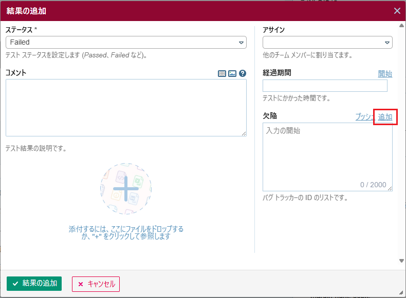 - テストの「結果の追加」画面の 欠陥 > 追加 リンクをクリックします。