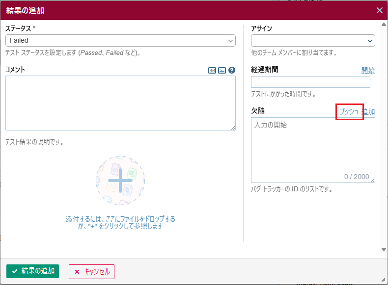 テストの「結果の追加」画面の 欠陥 > プッシュ リンクをクリックします。
