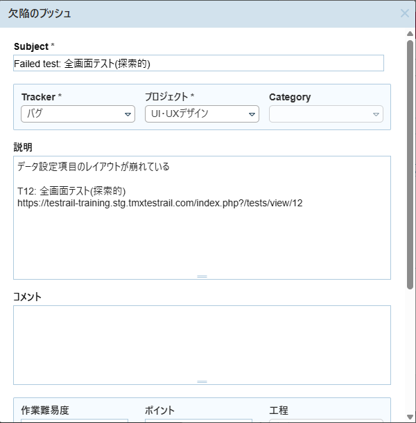 - 連携設定済みの課題管理ツールの新規バグ登録画面が開き、バグ情報を登録します。