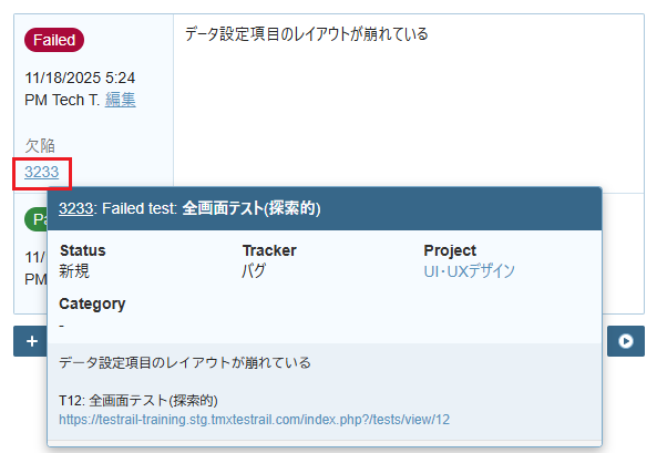 - 結果登録後、結果の一覧に登録した ID のリンクからバグ情報の画面に遷移できます。