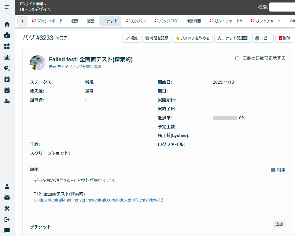 テスト実行中に発見されたバグ情報を元に、TestRail から課題管理ツール(Redmine や JIRA など)のチケットを新規に起票することができます。