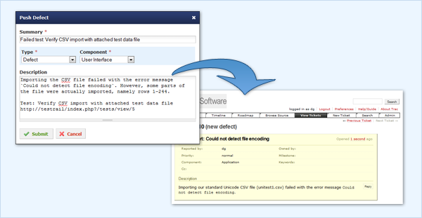 With the Defect Plugin configured, the option to push a new defect will appear in the Defect from Anywhere menu, as well as in the Add Result dialog within a test run. This dialog allows you to create a new issue in Trac without leaving TestRail.