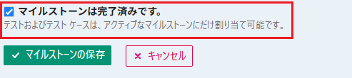 - 「マイルストーンの編集」画面で「マイルストーンは完了済みです。」チェックボックスを有効化して「マイルストーンの保存」ボタンを押下します。
