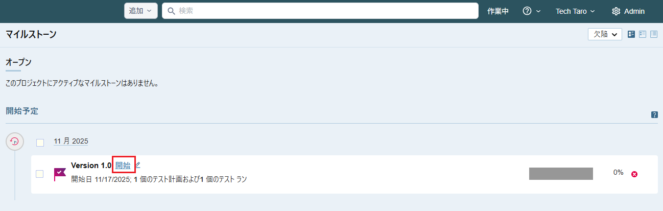 - テストランに結果を登録する前に、「マイルストーン」画面で作成済みの Version 1.0 マイルストーンを開始します。