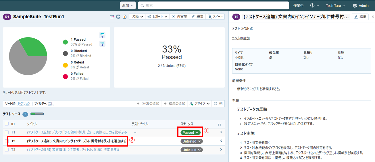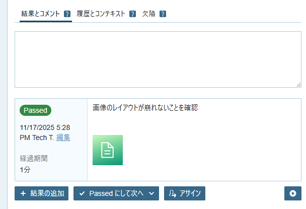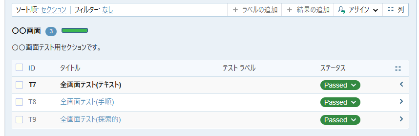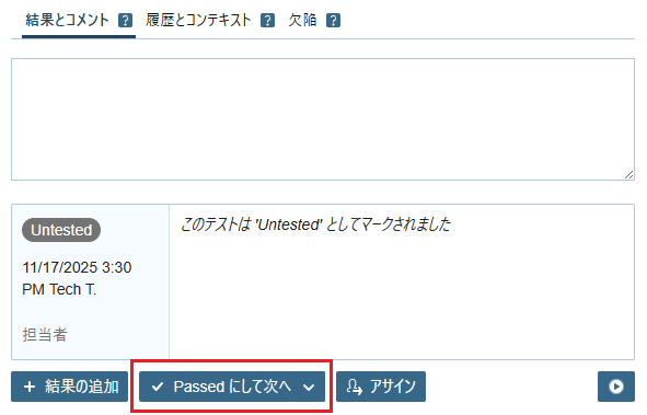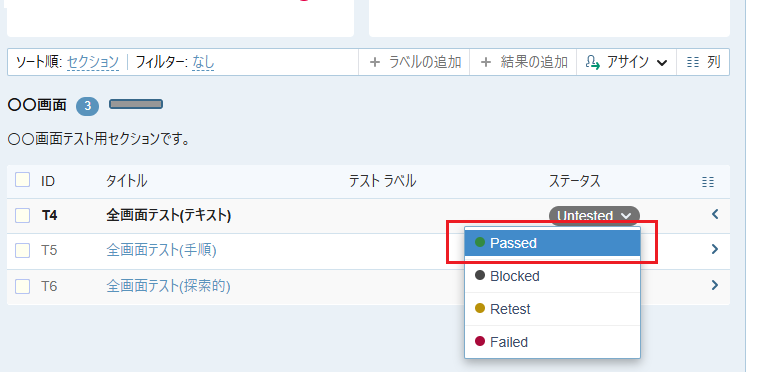 - 「全画面テスト (テキスト)」のステータス Untested をクリックして Passed を選択します。