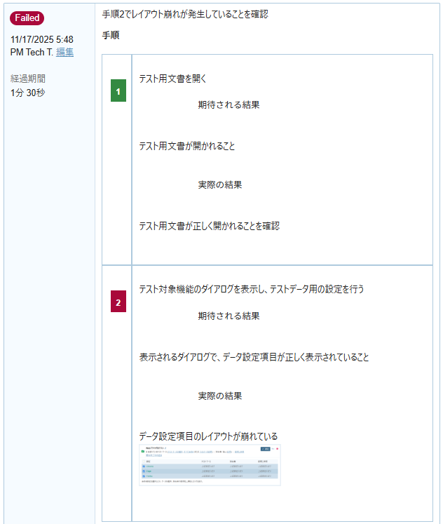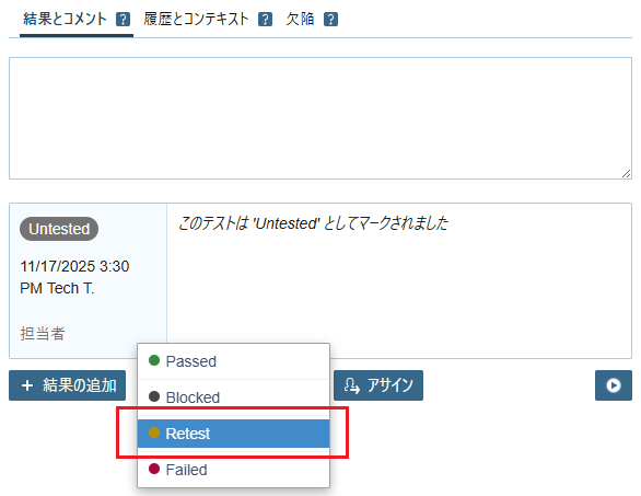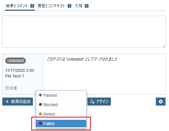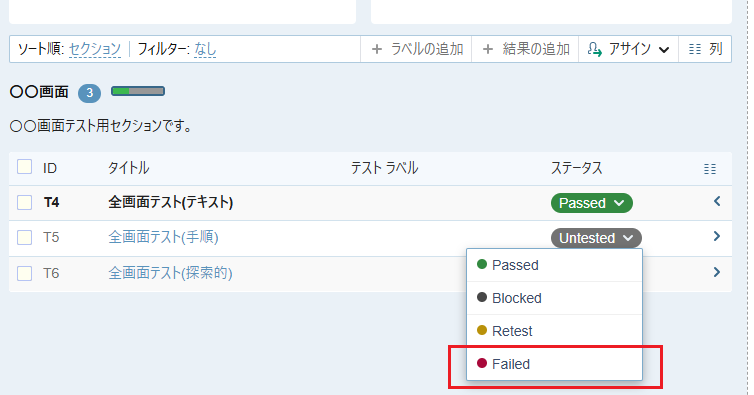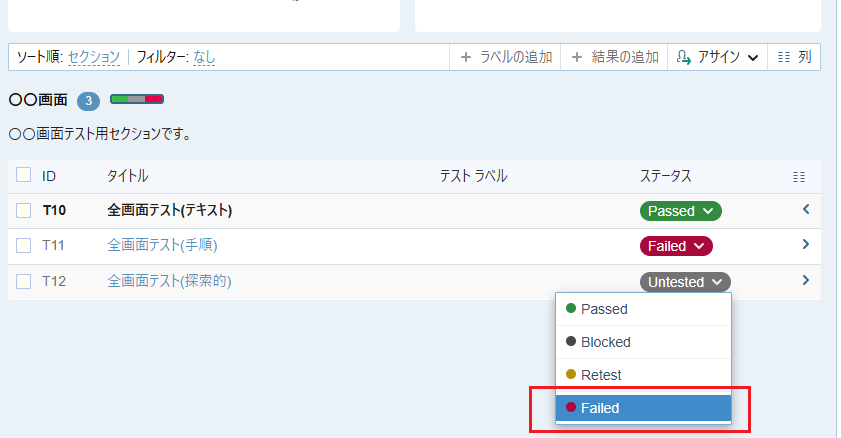 - 「全画面テスト (手順)」のステータス Untested をクリックして Failed を選択します。