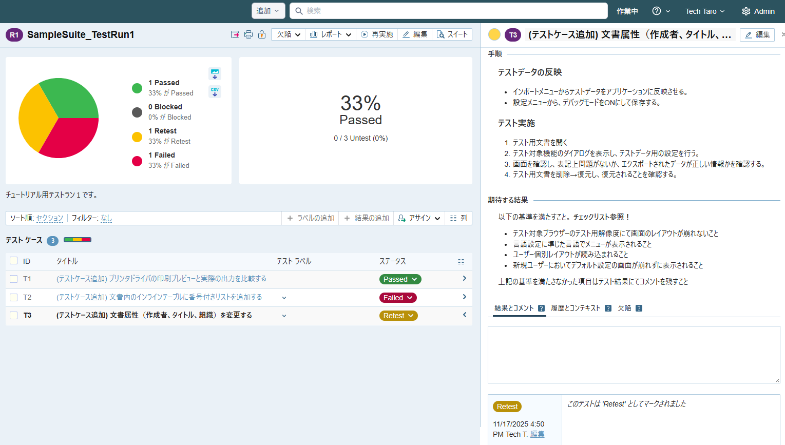 - 「(テストケース追加) 文書属性(作成者、タイトル、組織)を変更する」に対して 「Passed にして次へ」 ボタン横のプルダウンから Retest を選択します。