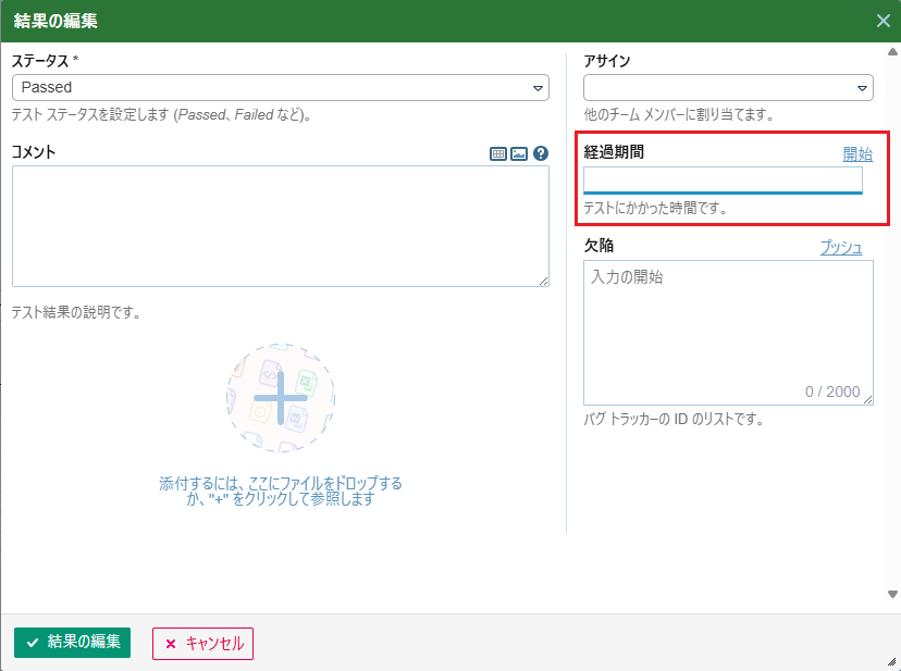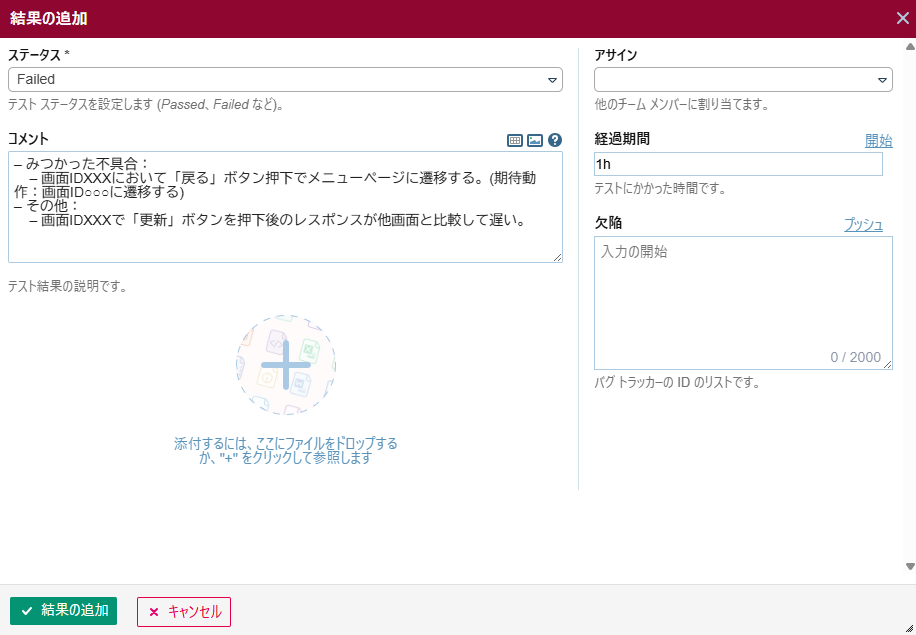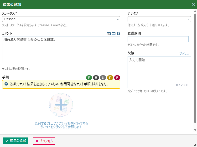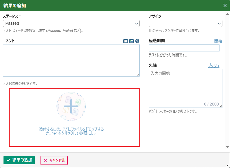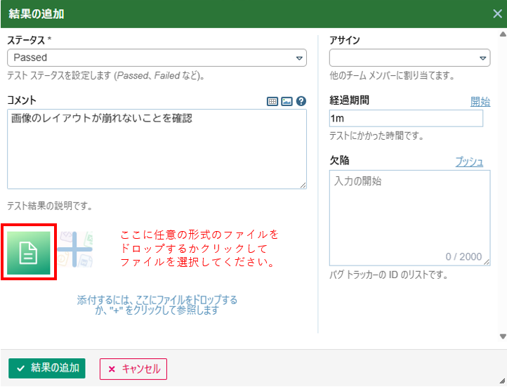 「結果の追加」ダイアログにおいて「ファイルを添付するにはここにドロップするか、”+”をクリックして参照します」のエリアに対して以下の操作を行うことでファイルを添付することができます。