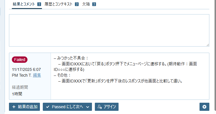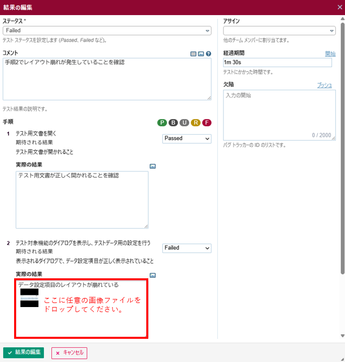 - テスト結果の詳細を入力します。