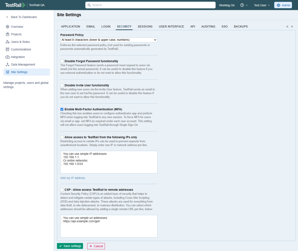 CSP は、TestRail が通信できるリモート アドレスを許可または制限するセキュリティ メカニズムであり、特定の種類の攻撃から保護するのに役立ちます。
