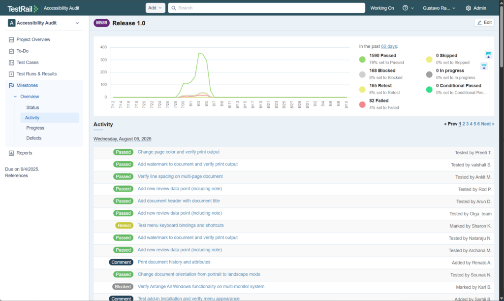 テストケースがどの子マイルストーン、テストラン、またはテスト計画に割り当てられているかにかかわらず、すべてのテストケースが個別に、日ごとのステータスとともに一覧表示されます。また、誰がテスト ケースを変更したのかも表示されます。