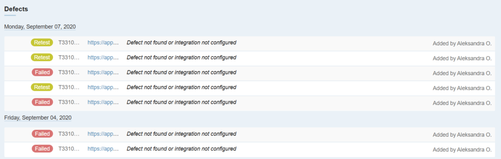 TestRail と (Jira などの) 統合されたプロジェクト管理ツールの間で簡単に情報をマッピングできるよう、報告されたすべての不具合のリストがあり、外部 ID およびステータスも表示されます。