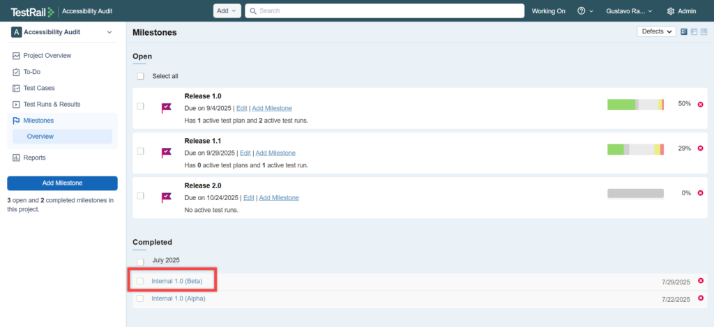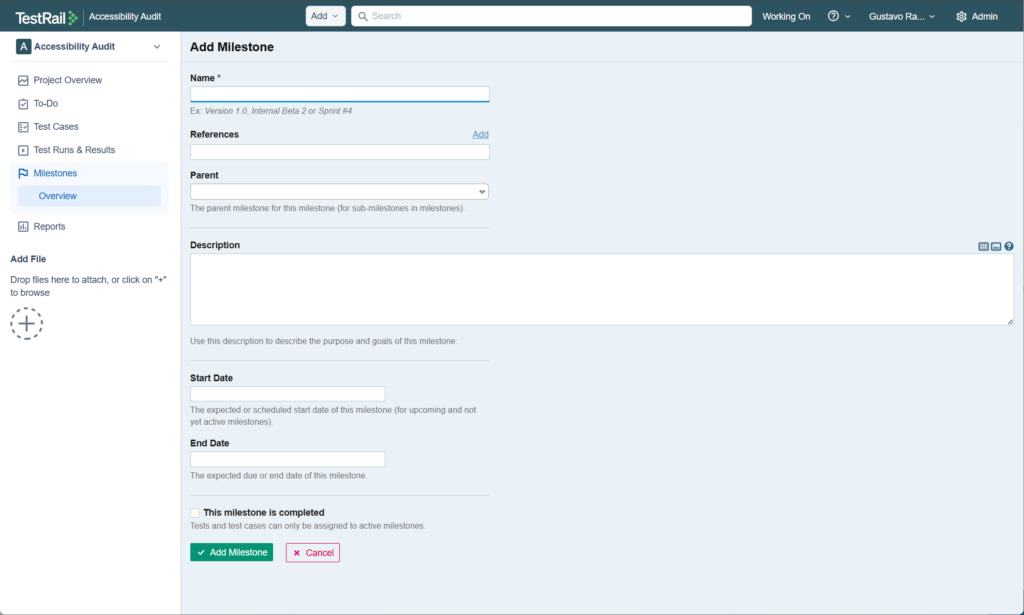 このセクションでは、TestRail で直接マイルストーンを作成し、管理するプロセスを説明します。これにより、TestRail をより効果的に導入し、活用できるようになります。マイルストーンを最大限に活用するための設定方法について、役立つヒントや推奨事項を説明します。このセクションを読み終える頃には、マイルストーンを簡単かつ効率的に管理できるようになっているはずです。