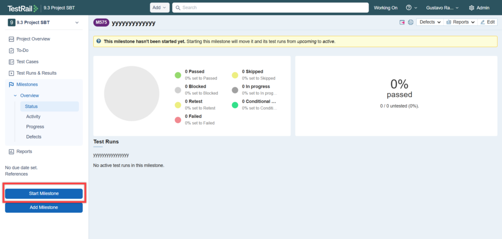 マイルストーンを開始するアクションは、割り当てられたすべてのテスト ランおよび/またはテスト計画のステータスを自動的に「開始予定」から「アクティブ」に更新するアクションをトリガーします。