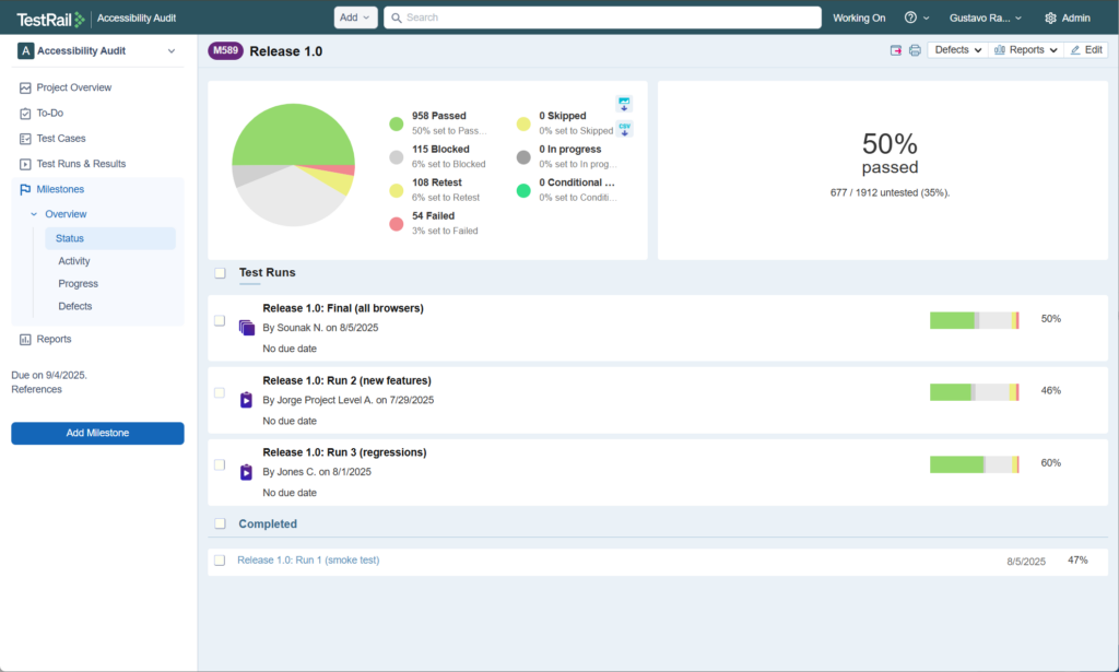 結論として、TestRail のマイルストーンは、管理作業のための貴重なツールとなります。収集され、ダッシュボードに表示されるデータは非常に有用で、すべてを俯瞰的に把握するのに役立ちます。これにより、潜在的な問題を予見し、作業をよりよく整理し、すべてのマイルストーンを調整し、プロジェクトを無事にリリースするための準備を整えることができます。