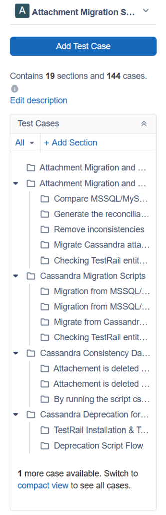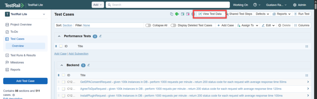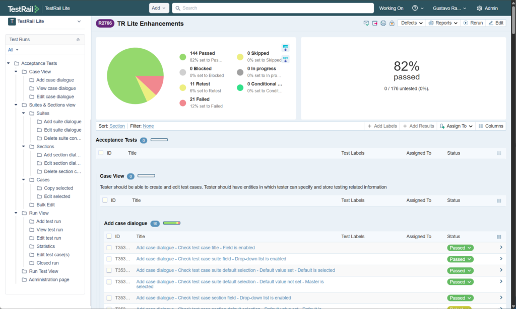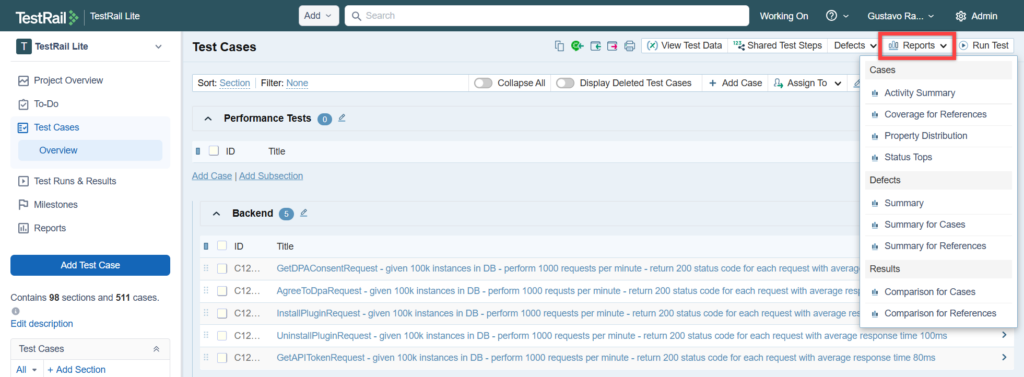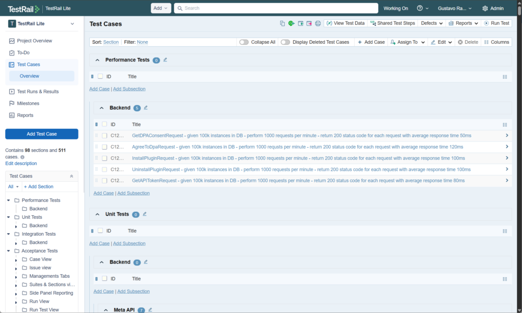 TestRail は、すべてのテストケースを 1 つの場所にまとめ、テスト ケースがテスト セクションにグループ化された見やすいインターフェイスを提供します。