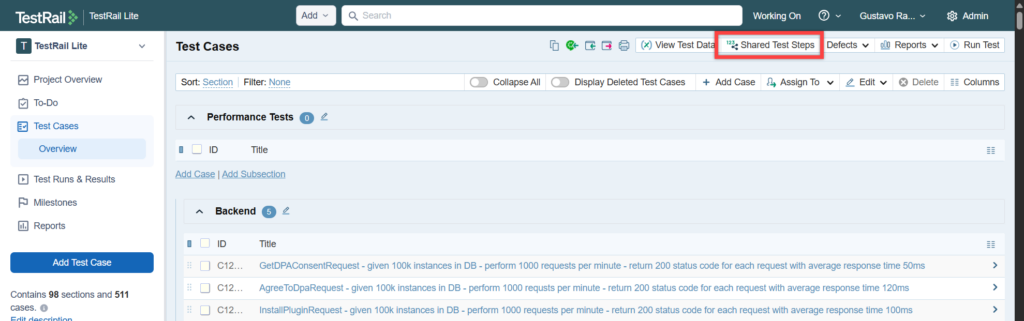 TestRail の共有テスト手順を利用すると、複数のテスト ケースで共通のステップを再利用できます。