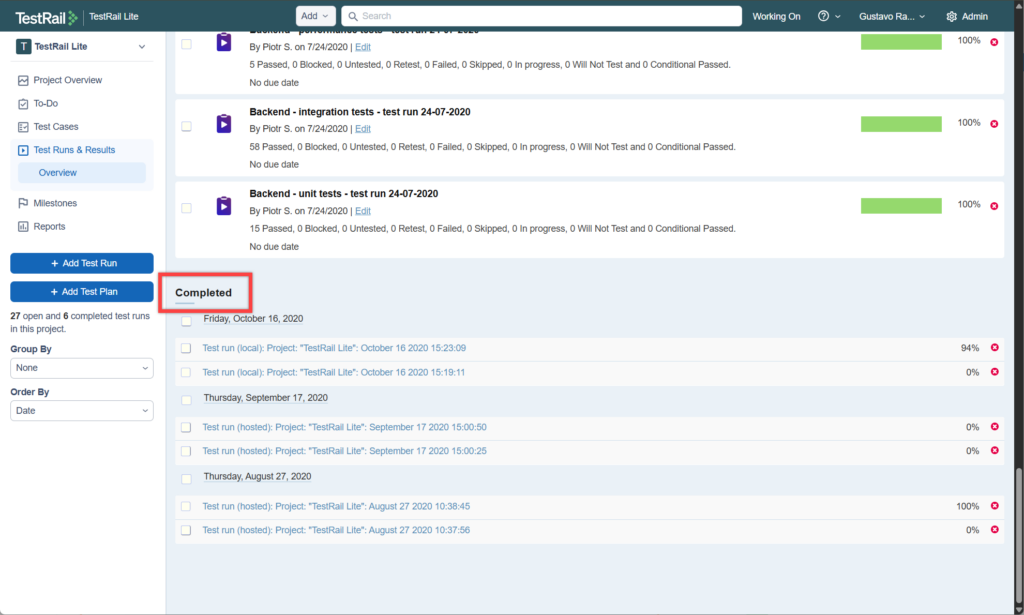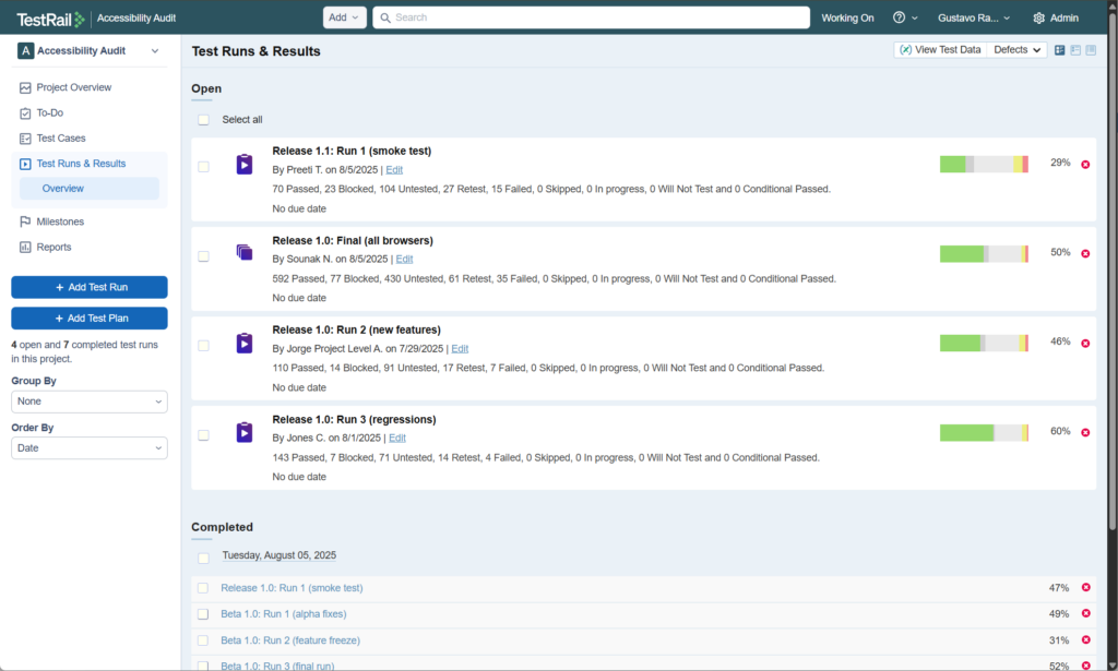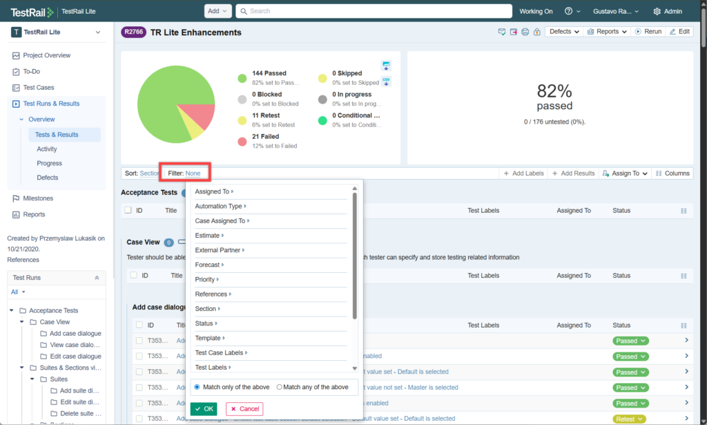 TestRail では、さまざまな基準 (Passed、Failed、Blockedなど) に基づいてテスト ランをフィルタリングできます。
