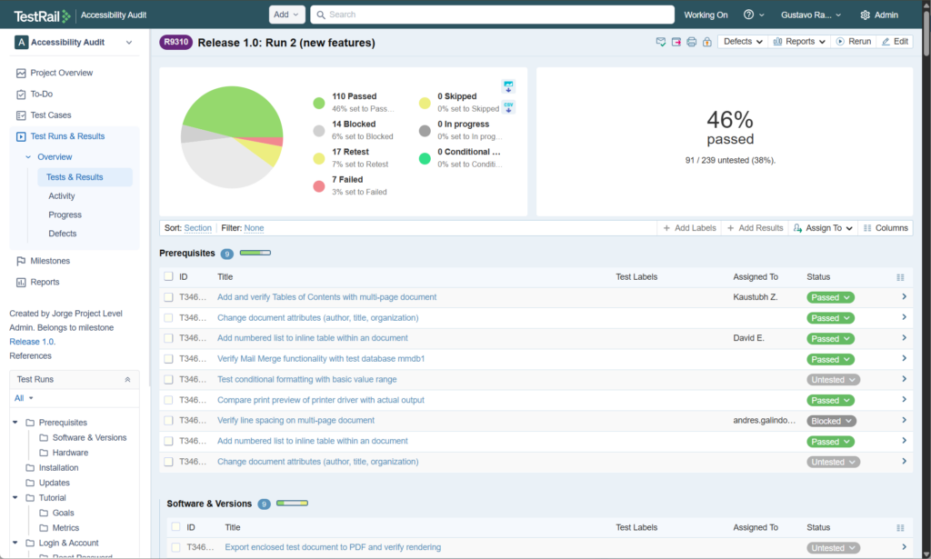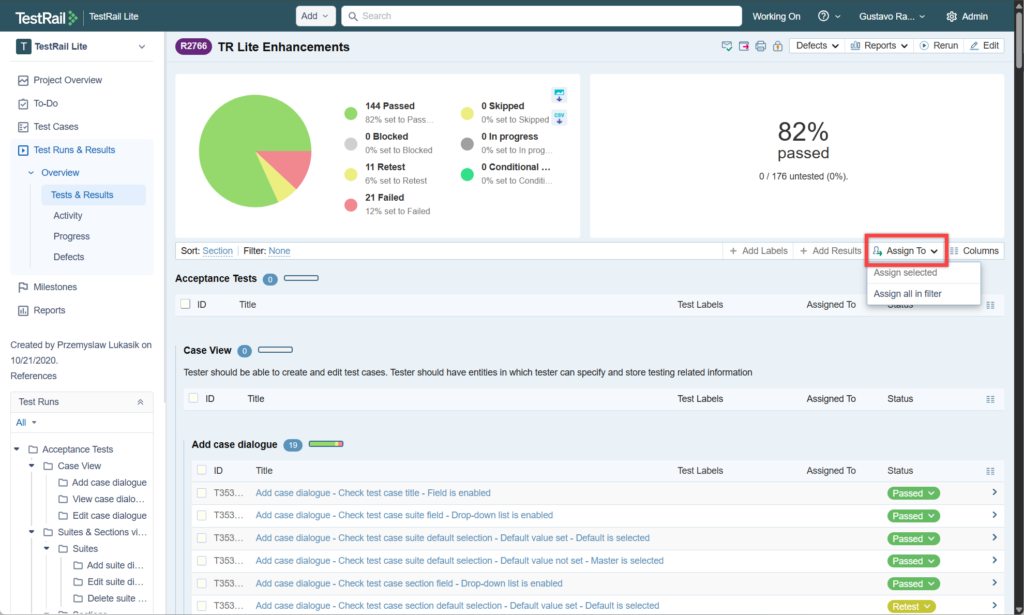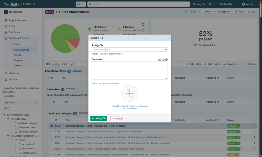 TestRail では、簡単にテスト ケースを特定のテスト担当者に割り当てることができるため、適切な担当者が適切なコンポーネントのテストを担当できるようになります。