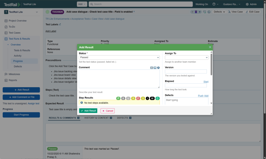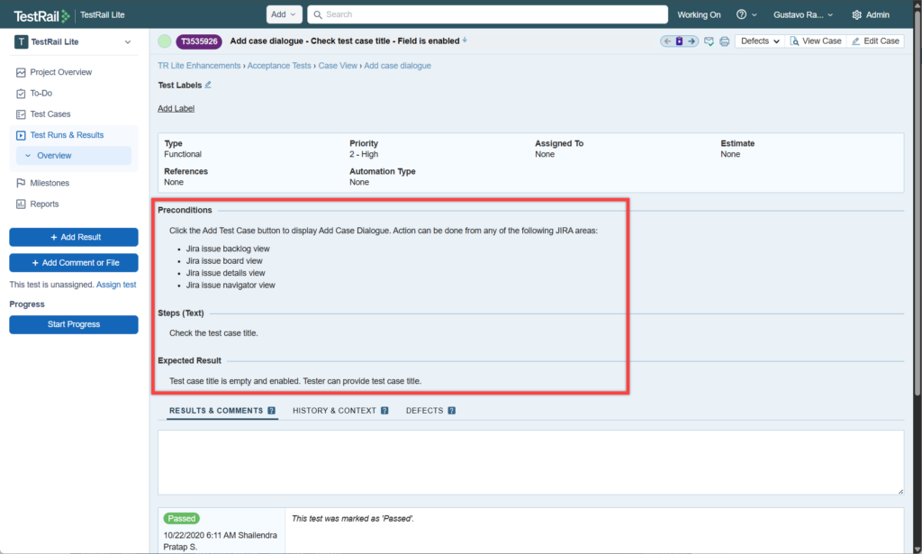 テスト担当者は、テストがブロックされたり失敗したりした場合、TestRail をただちに更新し、エラー メッセージ、スクリーン ショット、ログなど、できるだけ詳細な情報を提供する必要があります。