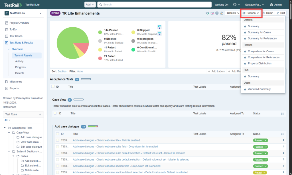 定期的なチェックポイントを設定し、テスト ランのメトリクス (合否率、テストの進捗状況、カバレッジの不足など) をレビューします。そのための洞察をレポートによって収集できます。レポートはテスト実行と結果モジュールから直接作成できます。
