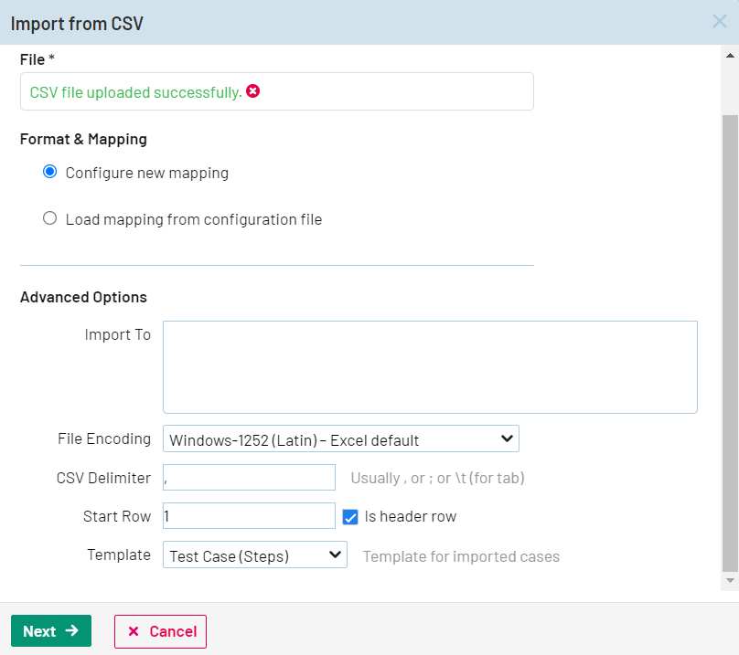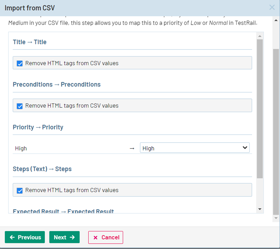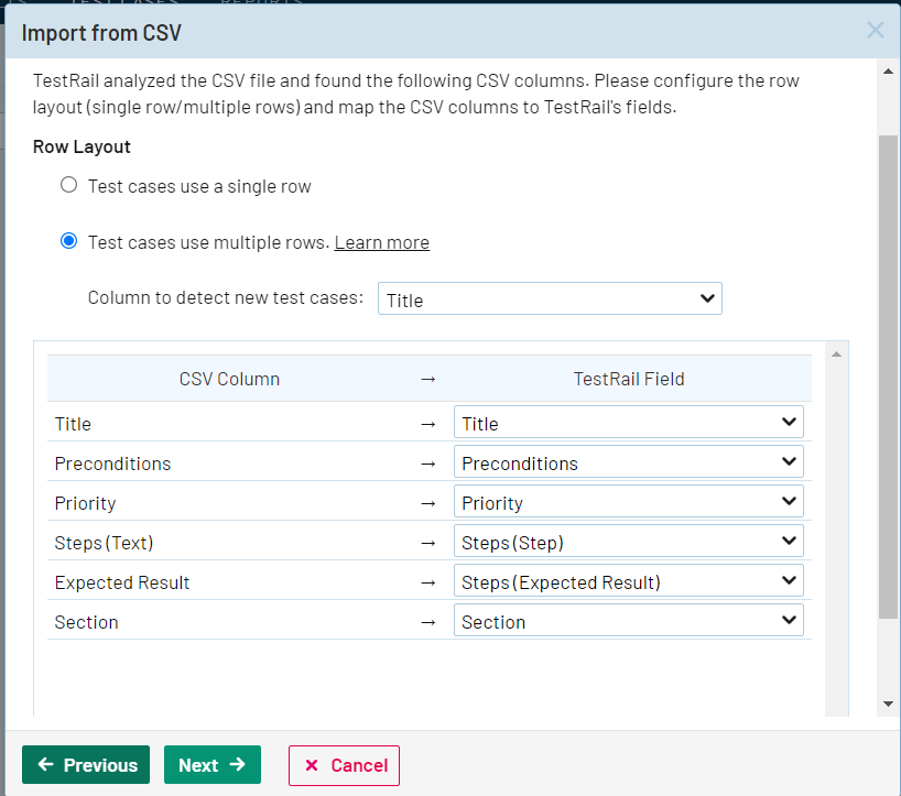 - CSV 列を適切な TestRail フィールドにマッピングします (下の図を参照)。
