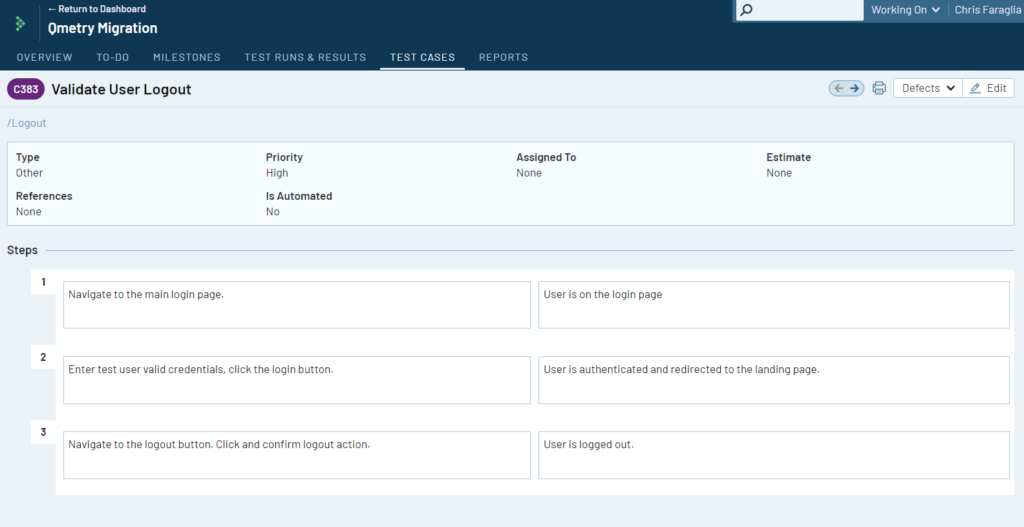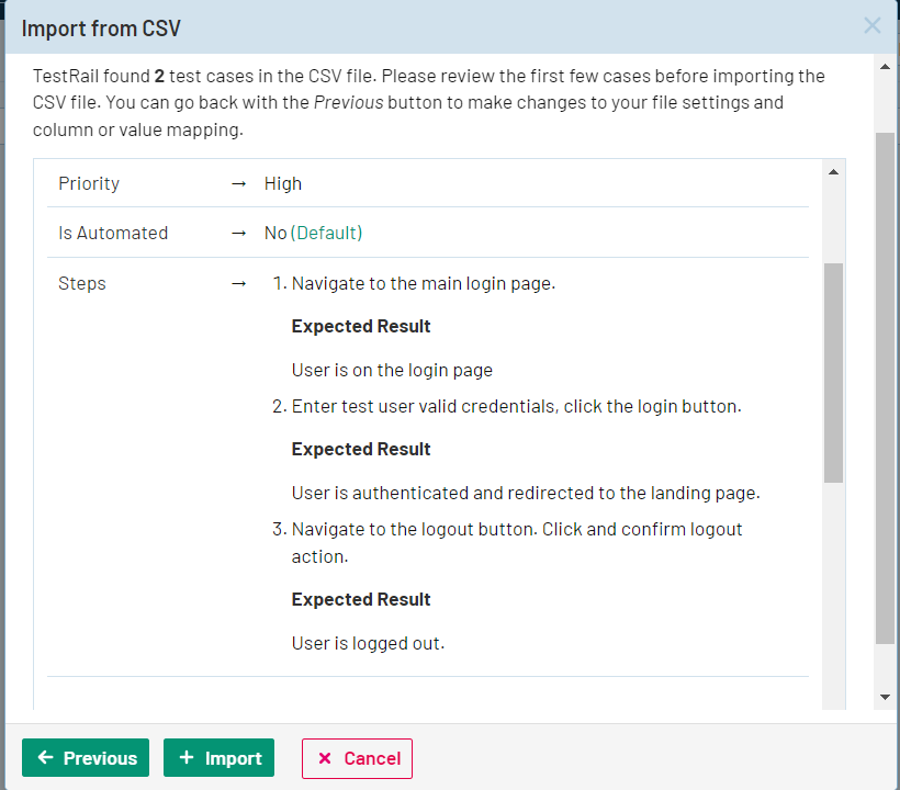 さらに、移行されたテスト ケースを選択すると、定義された CSV インポート マッピングに基づいて、対応するテストの詳細が表示されます。