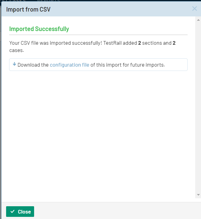 - インポートが成功したことを確認します (下のダイアログを参照)。今後の QMetry for Jira からのインポートのために、このインポート イベントで生成された設定ファイルを保存できます。