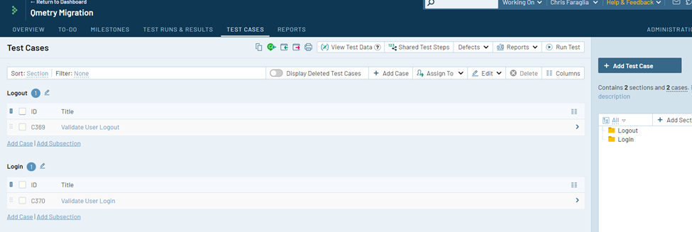 TestRail インスタンスの [テスト ケース] モジュールに戻ると、下の画像のようにインポートしたテスト ケースが表示されます。
