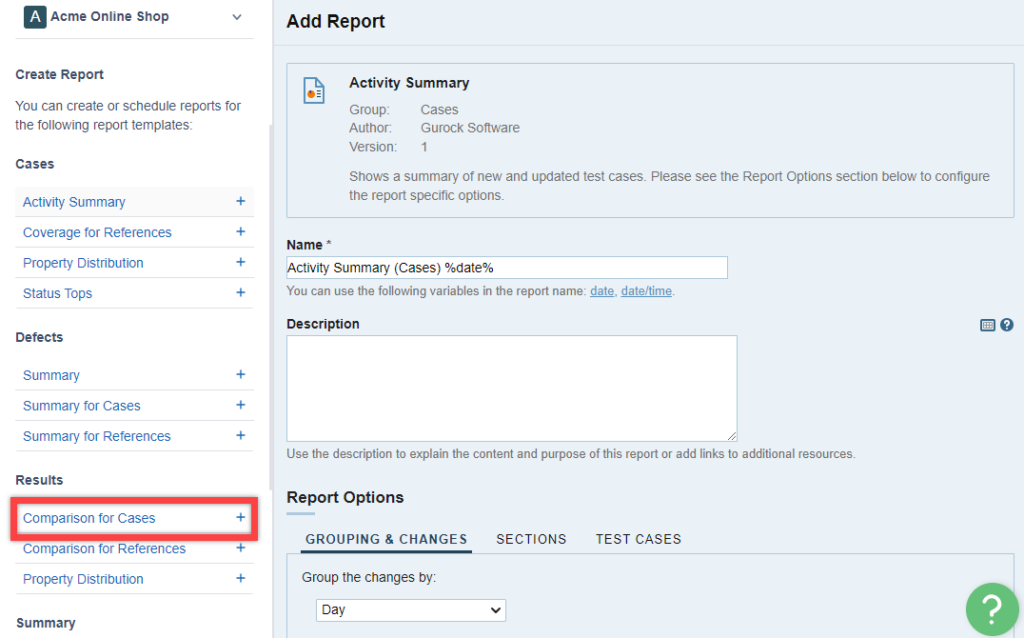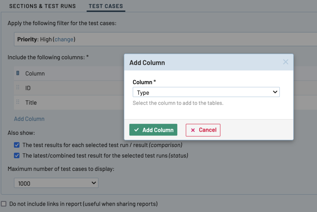 [レポートの追加] ページで [レポート オプション] セクションにスクロール ダウンします。[セクションとテスト ラン]、[テスト ケース] の 2 つのタブがあります。