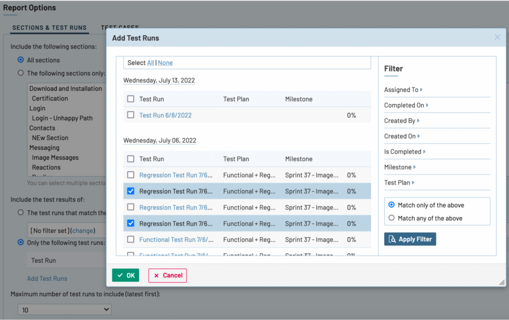 テスト結果を参照するテスト ランを選択します。これには 2 つの方法があります。1 つ目の方法は、1 つまたは複数のフィルターを適用して、フィルターに一致するテスト ランを選択することです。担当者、完了日、作成者、作成日、完了済み、マイルストーンなどのパラメーターを使用してテスト ランをフィルタリングできます。この方法は、特定の条件に当てはまる複数のテスト ランの結果を比較したい場合に役に立ちます。たとえば、特定のテスト計画内のすべてのテスト ラン、特定のリリースを追跡するために使用している複数のマイルストーンにわたるテスト ランなどです。