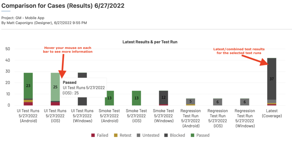 ケースの比較 (結果) レポートは、一連のテスト ランで実行したすべてのテスト ケースとその結果を表示します。レポート対象としてテスト ケースの特定のセクションを選択したり、テスト タイプ、優先度などのフィールドでレポートに表示されるテスト ケースをフィルタリングしたりできます。