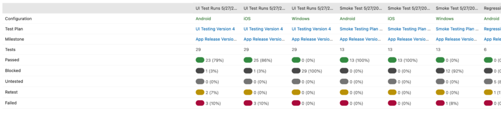 次に、レポートに含まれるテスト ランの一覧があり、さらにその後には、テスト ランに関連付けられた設定、テスト計画、マイルストーン (もしあれば)、テスト ランのテストの総数、選択されたテスト ランの Passed、Blocked、Untested、Retest、Failed ステータスのテスト数のサマリーを示す表があります。テスト計画外でテスト ランを作成した場合、またはテスト ランをマイルストーンにリンクしていない場合は、それらのフィールドは空白です。