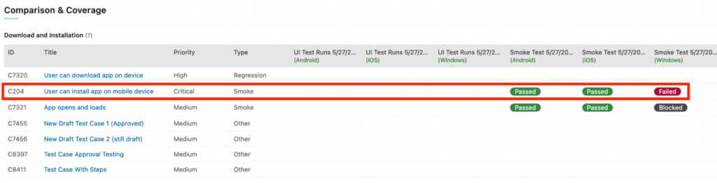 図のとおり、ID C204 のテスト ケース (User can install app on mobile device) の優先度は「Critical」に設定されており、テスト ケースに対して実行されたテストのタイプはスモーク テストです。また、スモーク テストは Android および iOS では成功したが、Windows では失敗したこともわかります。