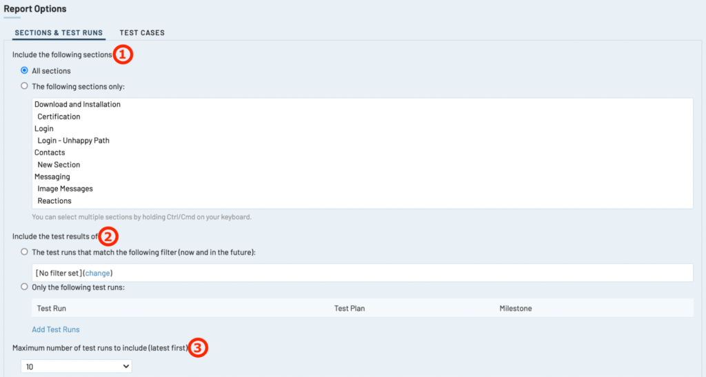 テスト ケースのすべてのセクションを含めるか、特定のセクションだけを含めるかを選択します。このオプションによって、テスト ケース リポジトリの特定のセクションの結果だけをレポートで示すことができます。たとえば、ログインやメッセージングなどの特定の機能にフォーカスしたい場合、それらのセクションだけを選択します。複数のセクションまたはサブセクションを選択するには、Ctrl/cmd キーを押したままセクションをクリックします。(プロジェクトが単一リポジトリではない場合、[セクションとテストラン] タブの代わりに [テストスイートとテストラン] タブが表示され、レポートに表示するテストスイートをフィルタリングできます。)